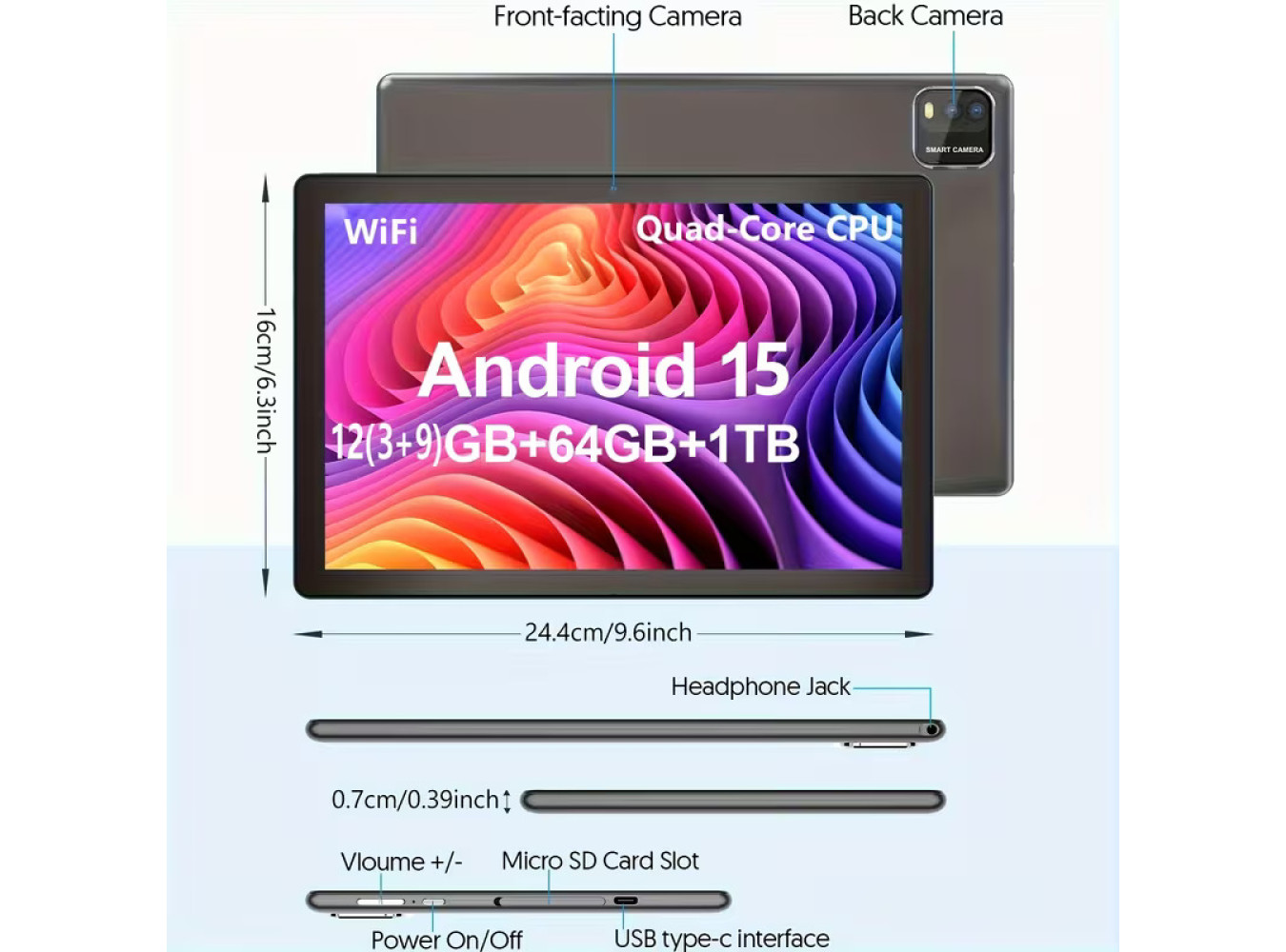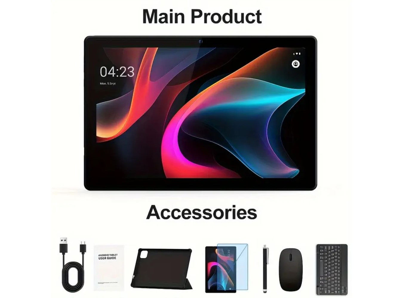 Experience smooth performance and versatility with this 10-inch Android 14 tablet, designed for work, study, and entertainment. The 1280x800 IPS display delivers sharp visuals and vibrant colors, perfect for streaming, reading, or video calls. Powered by a quad-core processor with 6GB RAM (3GB base + 3GB virtual) and 64GB built-in storage (expandable up to 1TB), it offers ample speed and space for apps, documents, and media.