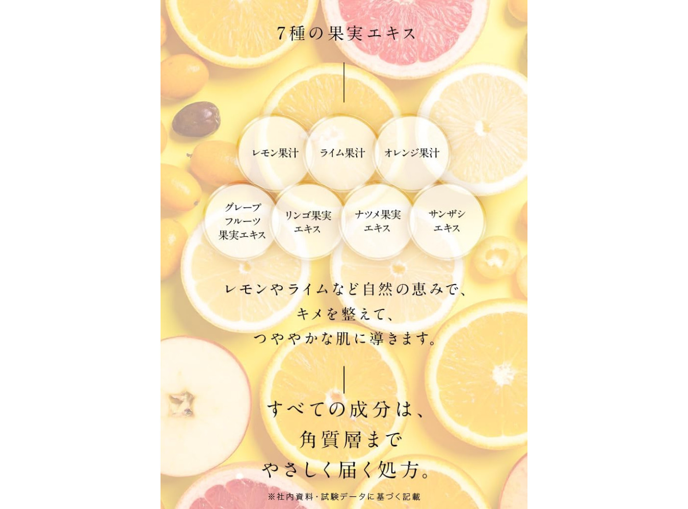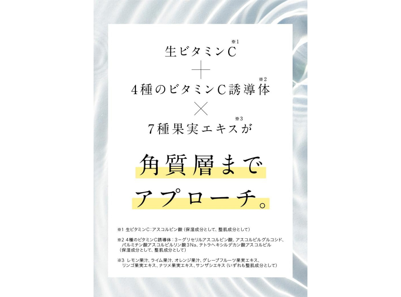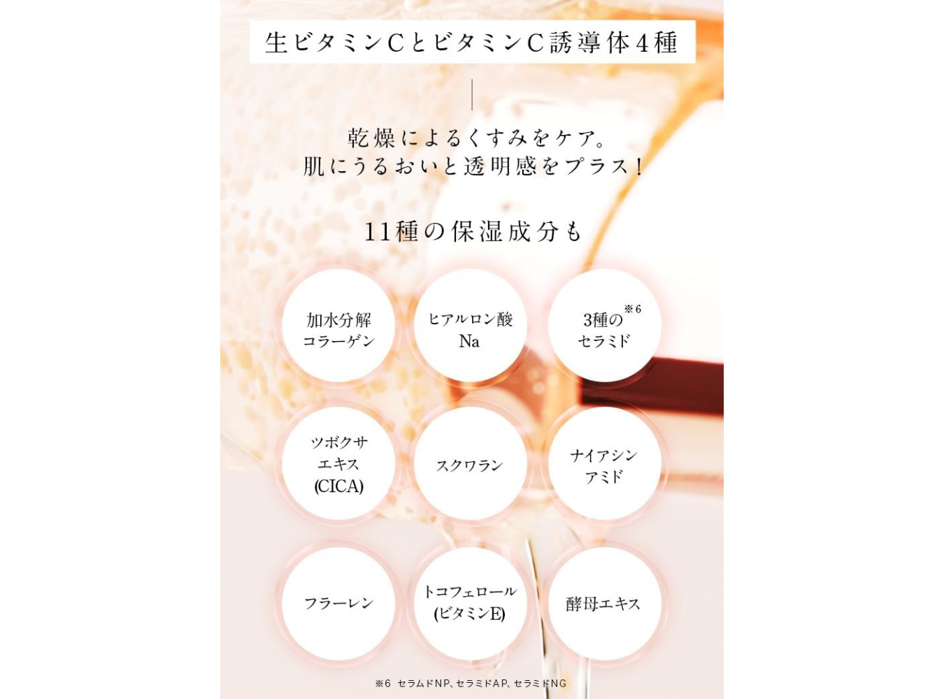 Water, BG, Glycerin, Pentylene Glycol, Ascorbic Acid, 3-Glyceryl Ascorbic Acid, Ascorbyl Glucoside, 3NA Palmitate, Ascorbyl Phosphate, Tetrahexyl Decanate, Niacinamide, Fullerene, Glycyrrhyl Acid 2K, Hydrolyzed Collagen, Squalane, Sodium Hyaluronic Acid. Ceramide NP, Ceramic DoAP, Ceramide NG, Yeast Extract, Trapeze Extract or Trapezia Leaf Extract, Lemon Juice, Lime Juice, Orange Juice, Grapefruit Fruit Extract, Apple Fruit Extract, Nutmeg Fruit Extract, Sandwich Extract, Sodium Alginate, Carbomer, Alkaline Polysaccharide, Xanthan Gum, PVP, Hydrated Ethylene, Phytoste Rolls, Polyso Rubate 80, Titanium Oxide, Iron Oxide, K Hydroxide, Phenoxyethanol