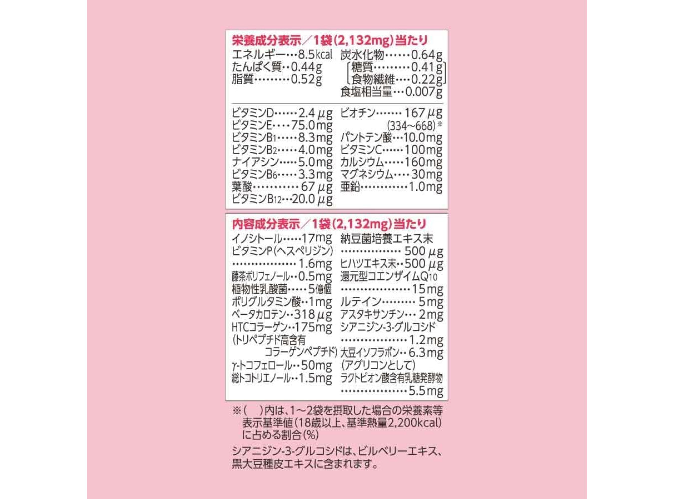Contents of a Single Pack: Vitamins B and C, Triple Mineral / Lactobacillus / Carotene, Emulsified DHA / Hydroxy-Tyrosol, Blueberry, GABA and Coenzyme Q10, HTC Collagen, Iron and Folic Acid; Allergens: Gelatin;