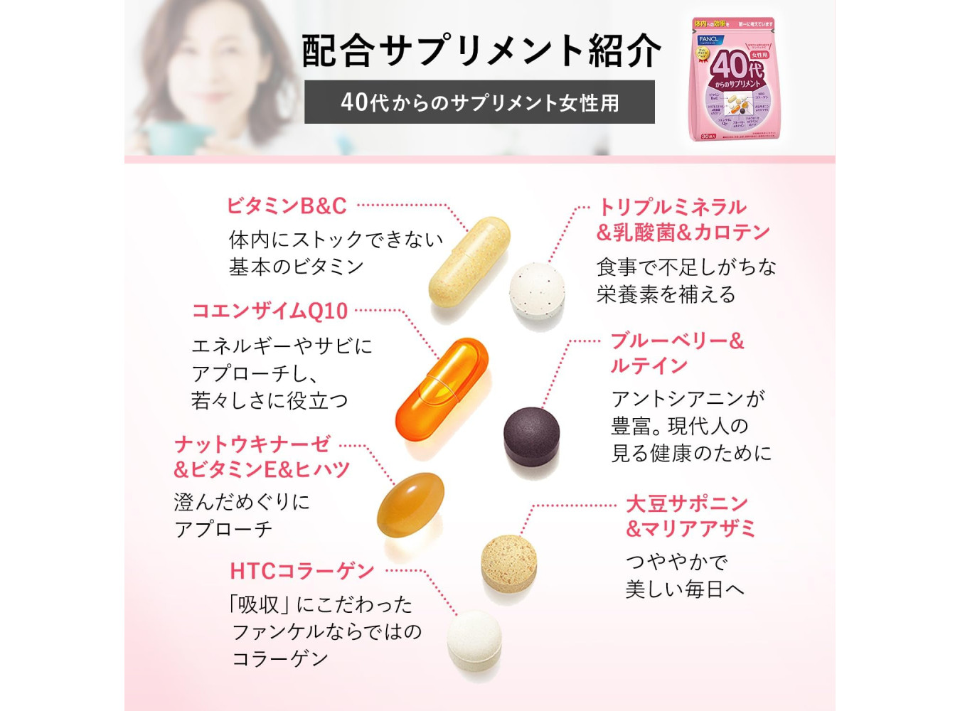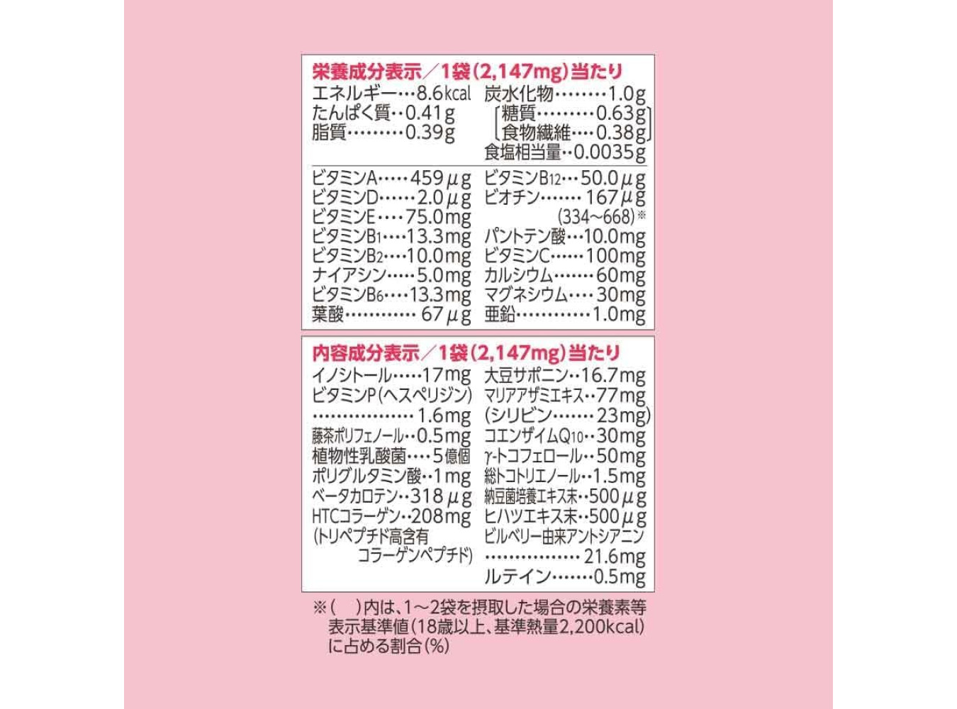 Contents of a Single Pack: Vitamins B and C, Triple Mineral / Lactobacillus / Carotene, Emulsified DHA / Hydroxy-Tyrosol, Blueberry, GABA and Coenzyme Q10, HTC Collagen, Iron and Folic Acid; Allergens: Gelatin;