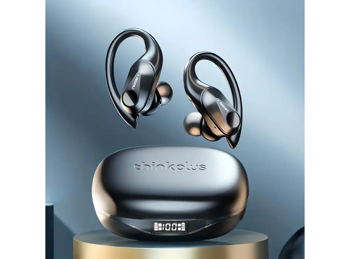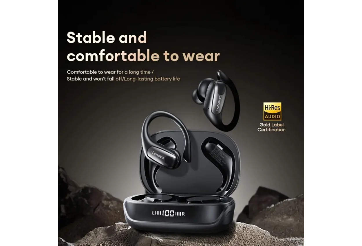 This is Brand New Lenovo LP75 earbuds are designed with a secure ear-hook style that helps keep them stable during sports or physical activities, making them less likely to fall out compared to traditional earbud designs. The ear hooks are made from liquid silicon plastic, providing a comfortable yet firm fit that adapts well to the ear shape, ideal for active users. These earbuds also feature IPX5 waterproofing, so they can handle sweat and light rain without damage, which adds to their suitability for sports.