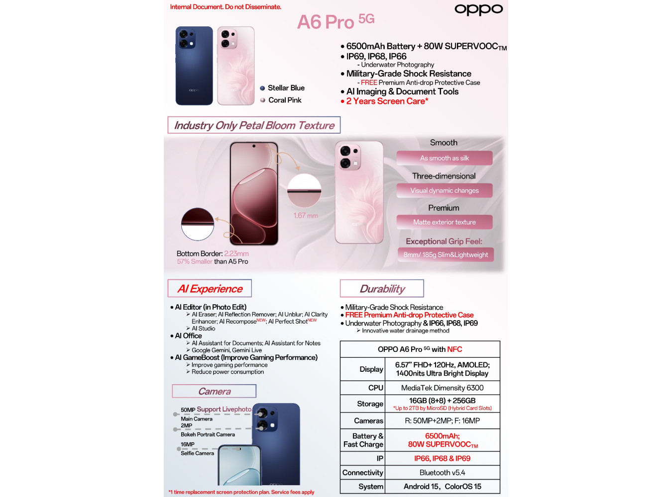 Experience the perfect blend of sophisticated design and robust performance with the all-new OPPO A6 Pro 5G. Encased in a slim, 8mm body with an exceptional grip feel, its stunning design is available in Stellar Blue and Coral Pink, featuring the industry's exclusive Petal Bloom Texture for a smooth, matte finish that's as beautiful as it is durable.