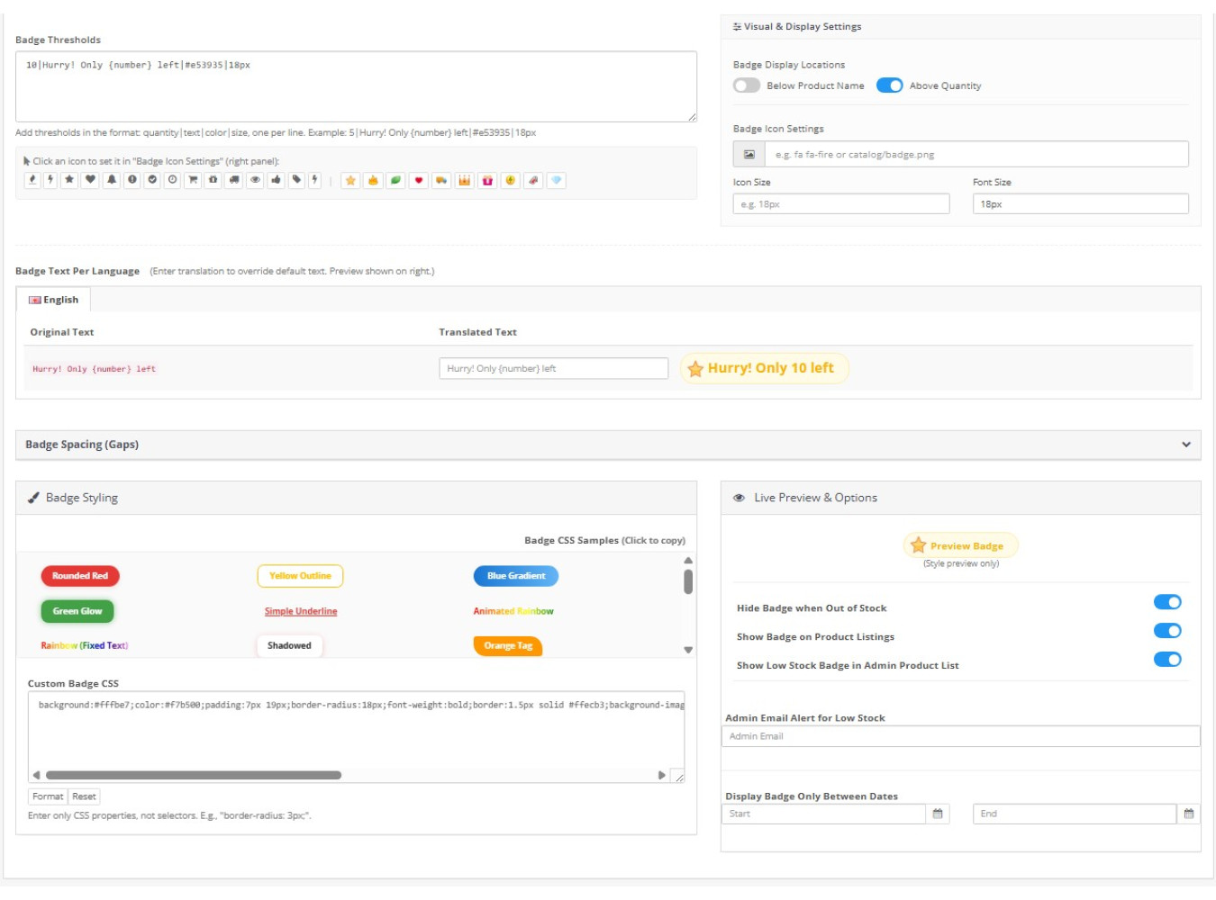 - Context-Aware Display: Control exactly where badges appear—Below Product Name, Above Quantity input, or on Category/Search listings.