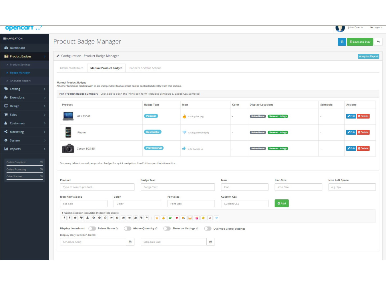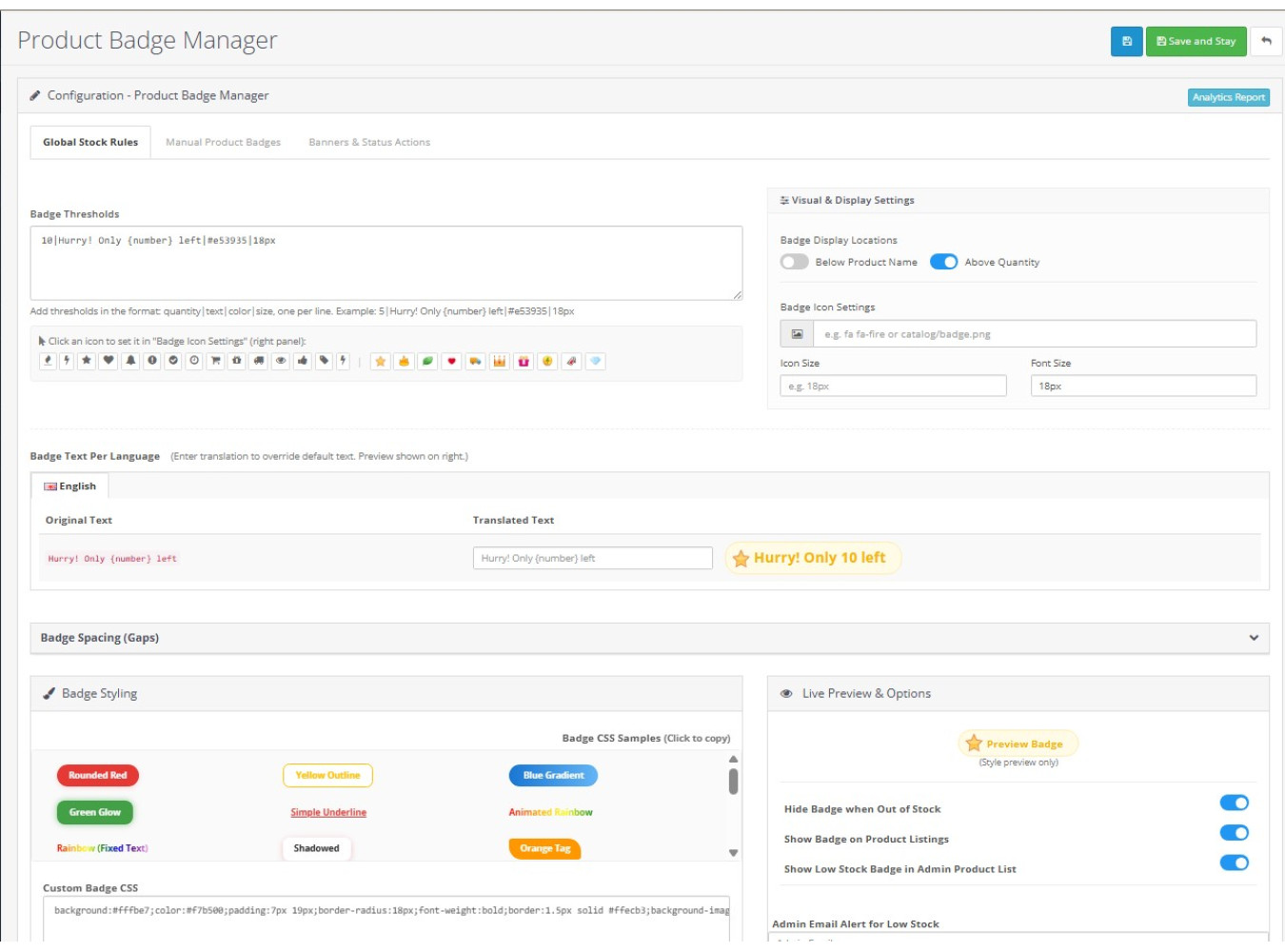 This extension centralizes all badge management into one intuitive dashboard. You can define global rules based on stock quantity, manually override settings for specific products, and schedule badges for time-sensitive promotions. The interface features a modern analytics report, live CSS previews, and granular control over display locations (Product Page, Category/Search Listings, and Module tiles like Bestsellers/Featured).