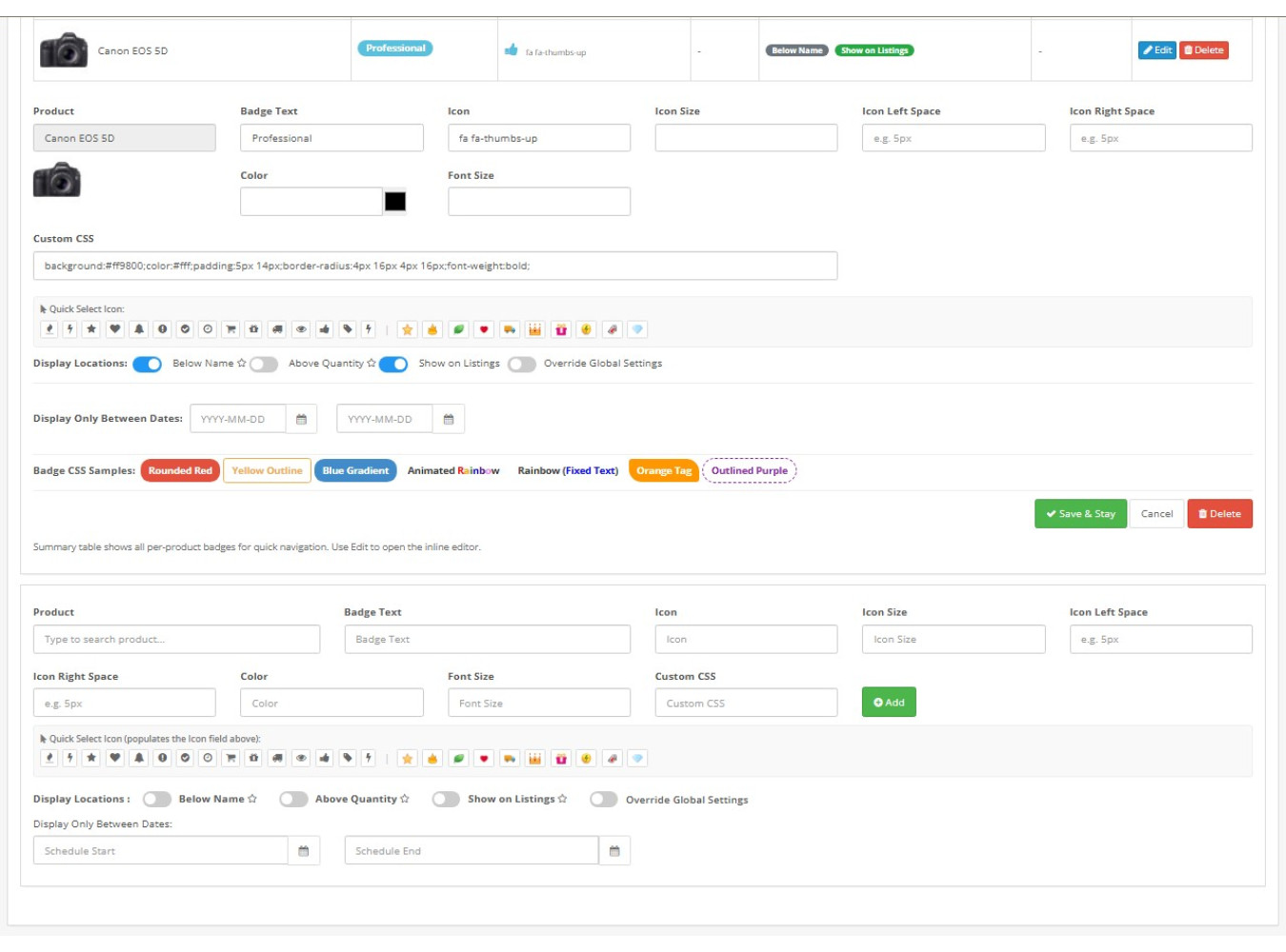 - Per-Product Overrides: Manually assign badges, icons, and schedules to specific products, overriding global rules.