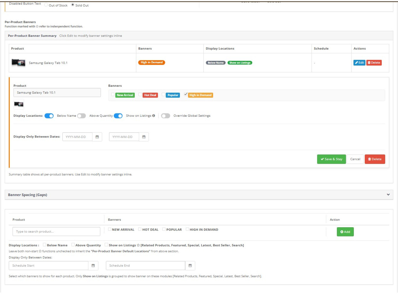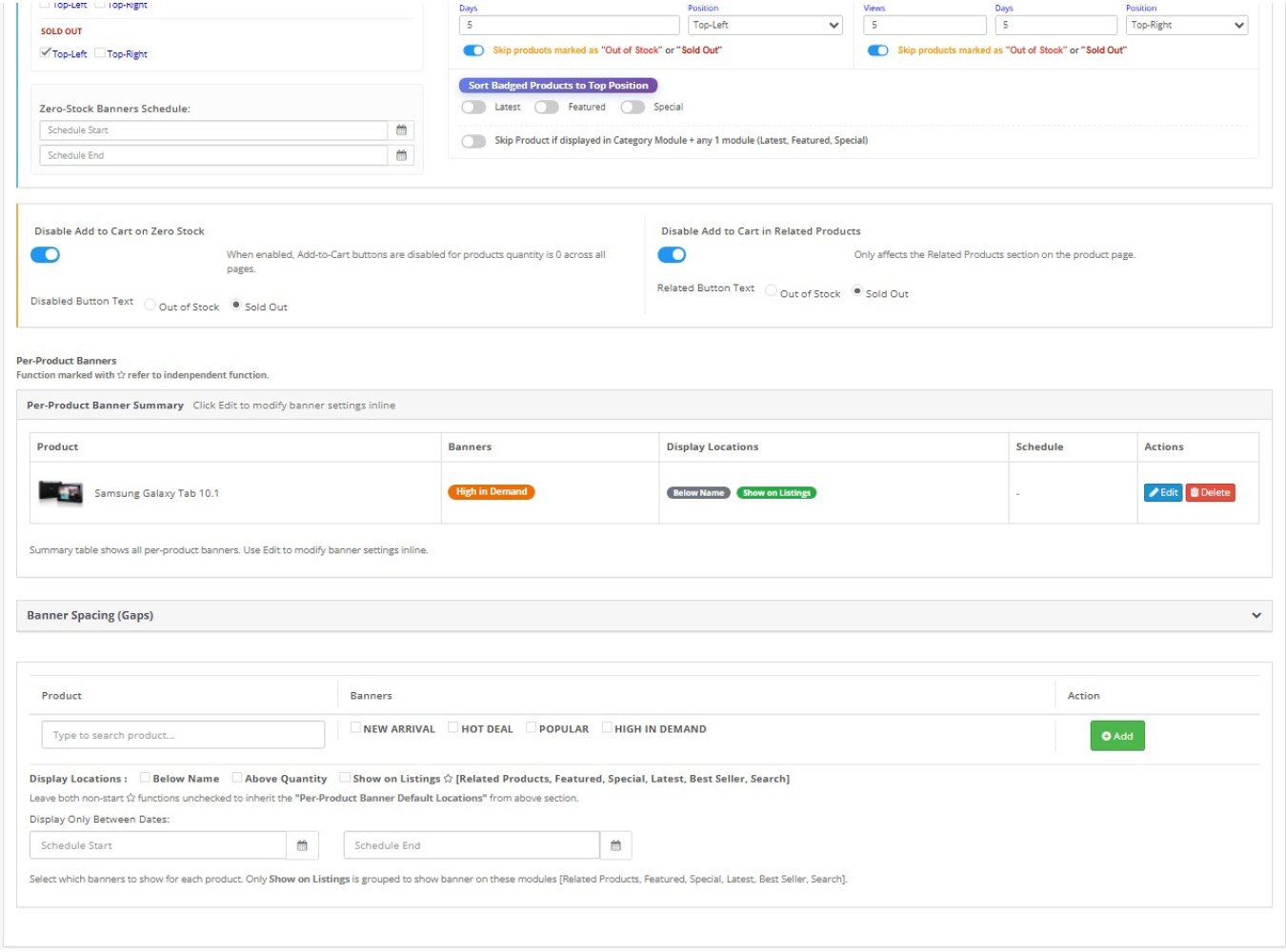 2. Banners: Go to "Banners & Status Actions" tab. Enable "Show OUT OF STOCK on qty = 0" and configure "Triangle Corner Badges".