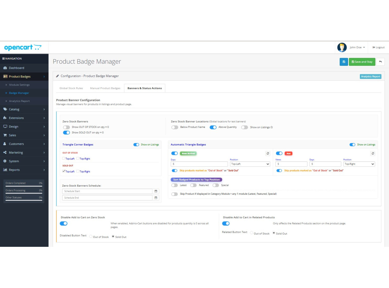 Product Badge Manager is a comprehensive OpenCart 3.x admin extension designed to boost conversion rates by adding visual urgency and social proof to your store. It allows store owners to create and manage various types of product badges: automatic stock status text (e.g., "Only 2 left!"), corner-triangle ribbons, per-product visual banners (New Arrival, Hot Deal), and functional status actions (like disabling "Add to Cart" for zero stock).